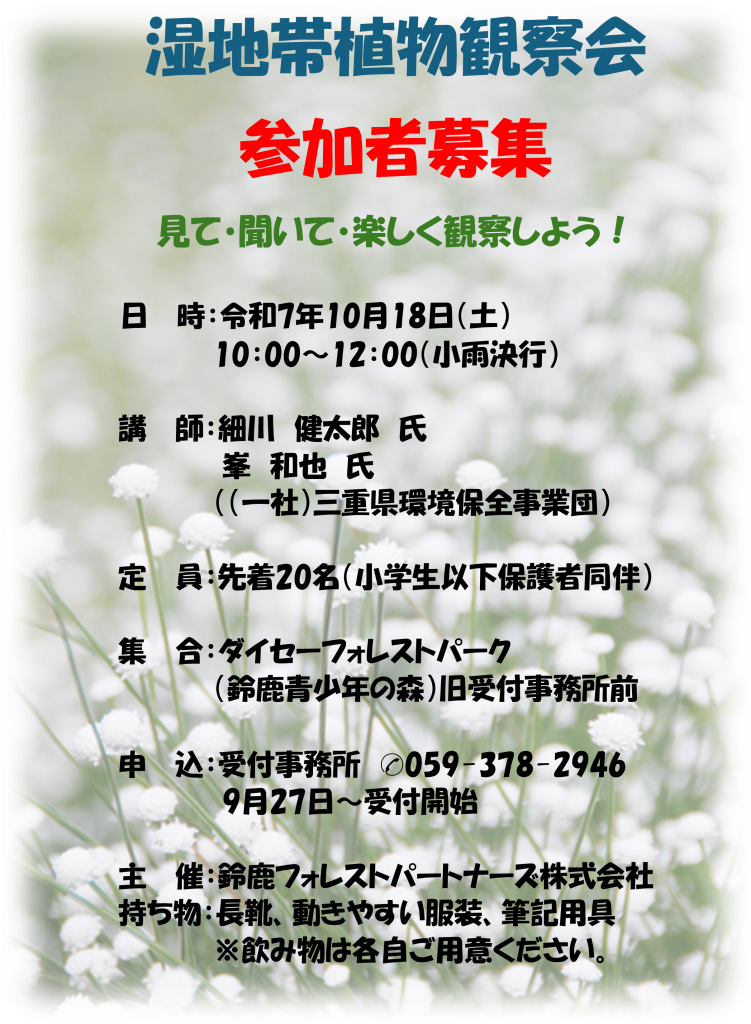 2025.09.26 新着情報 2025年10月18日(土)湿地帯植物観察会 参加者募集について 10月18日(土)10時~三重県環境保全財団 細川健太郎氏・峯和也氏を講師に迎え、湿地帯植物観察会を行います。 希少な湿地帯植物をこの機会に実際に観察してみませんか。